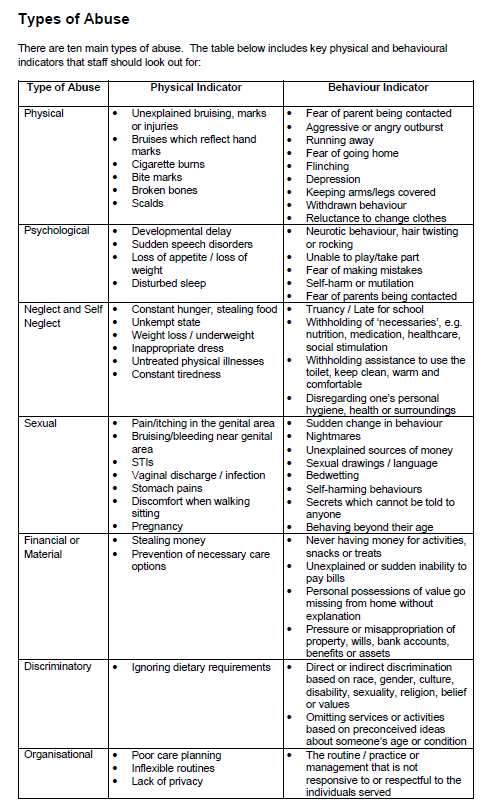 Everyone should be aware of the potential indicators of abuse and know what to do if they have concerns. It is however not the responsibility of the Council to investigate or determine whether abuse is taking place. The Council’s responsibility is to identify and report abuse.